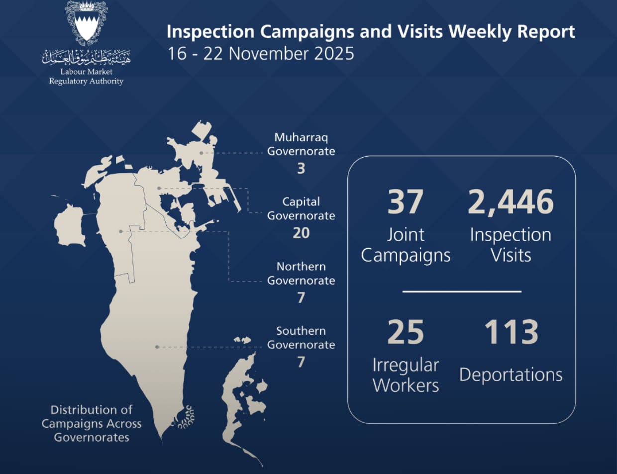 നവംബര് 16 മുതല് 22 വരെയുള്ള കാലയളവില് 2,446 പരിശോധനകളാണ് നടത്തിയതെന്ന് എല്.എം.ആര്.എ. അറിയിച്ചു. നിയമം ലംഘിച്ച് ജോലി ചെയ്ത 25 വിദേശികളെ കസ്റ്റഡിയിലെടുത്തിട്ടുമുണ്ട്.