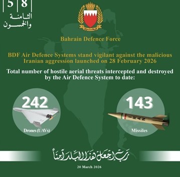 മനാമ: ബഹ്റൈനു നേരെയുള്ള ഇറാന്റെ ആക്രമണത്തിന്റെ തുടക്കം മുതല് ഇതുവരെ ബഹ്റൈന് പ്രതിരോധ സേന (ബി.ഡി.എഫ്) ഇറാന്റെ 143 മിസൈലുകളും 242 ഡ്രോണുകളും തടഞ്ഞുനിര്ത്തി തകര്ത്തതായും ഇറാനിയന് ആക്രമണത്തിന്റെ തുടര്ച്ചയെ തുടര്ന്നും തടയുന്നുണ്ടെന്നും ബി.ഡി.എഫ്. ജനറല് കമാന്ഡ് അറിയിച്ചു.