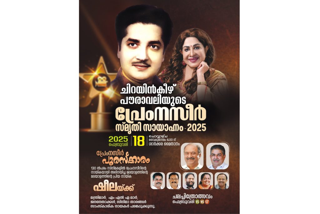 തിരുവനന്തപുരം: മലയാള സിനിമയുടെ നിത്യഹരിത നായകൻ പത്മഭൂഷൻ പ്രേംനസീന്റെ സ്മരണാർത്ഥം ചിറയിൻകീഴ് പൗരാവലി ഏർപ്പെടുത്തിയ പ്രേംനസീർ പുരസ്കാരം നടി ഷീലയ്ക്ക് ഫെബ്രുവരി 18ന് സമ്മാനിക്കും. പ്രേംനസീറിന്റെ ജന്മനാടായ ചിറയിൻകീഴിലെ ശാർക്കര മൈതാനത്ത് നടക്കുന്ന പ്രേംനസീർ സ്മൃതി സായാഹ്നം ധനകാര്യ മന്ത്രി കെ.എൻ. ബാലഗോപാൽ ഉദ്ഘാടനം ചെയ്യും.