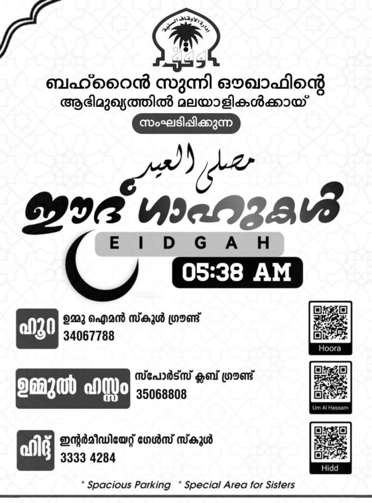 ഹൂറ ഉമ്മു അയ്മൻ ഗേൾസ് ഹൈ സ്കൂൾ ഗ്രൗണ്ട്, ഉമ്മുൽ ഹസ്സം സ്പോർട്സ് ക്ലബ്ബ് ഗ്രൗണ്ട്, ഹിദ്ദ് ഇന്റർമീഡിയറ്റ് ഗേൾസ് ഹൈ സ്കൂൾ ഗ്രൗണ്ട് എന്നിവിടങ്ങളിൽ നടക്കുന്ന ഈദ് നമസ്ക്കാരങ്ങൾക്ക് പ്രമുഖ പണ്ഡിതർ നേതൃത്വം വഹിക്കും.ഈദ് ഗാഹുകളുടെ സുഗമമായ നടത്തിപ്പിനായി വിശാലമായ പാർക്കിങ് സൗകര്യങ്ങൾ ഏർപ്പടുത്തിയിട്ടുണ്ടെന്നും സ്ത്രീകൾക്കും കുട്ടികൾക്കും പ്രത്യേക സൗകര്യം ചെയ്തിട്ടുണ്ടെന്നും ഭാരവാഹികൾ അറിയിച്ചു.ഈദ് ദിവസം രാവിലെ 5:38 ന് ആരംഭിക്കുന്ന നമസ്കാരത്തിലേക്ക് എല്ലാവരും കൃത്യ സമയത്ത് തന്നെ എത്തിച്ചേരേണ്ടതാണ്.