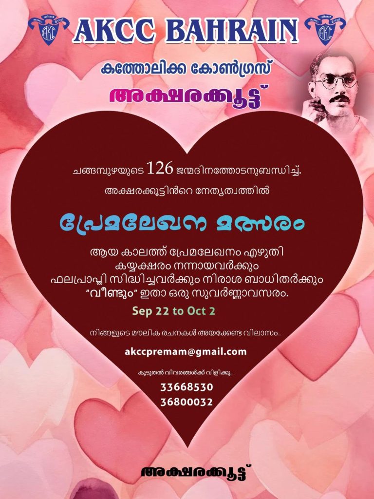 ചങ്ങമ്പുഴ കൃഷ്ണപിള്ളയുടെ 126- മത് ജന്മവാർഷിക ദിനത്തോടനുബന്ധിച്ച് ബഹ്റൈൻ എ.കെ. സി. സി യുടെ വായന താൽപര്യരും എഴുത്തുമോഹികളുടെയും കൂട്ടായ്മയായ അക്ഷരക്കൂട്ടിന്റെ നേതൃത്വത്തിൽ ചങ്ങമ്പുഴയുടെ 126മത് ജന്മ വാർഷിക ദിനത്തോടനുബന്ധിച്ച്, പ്രവാസികൾക്കായി പ്രേമലേഖന മത്സരം സംഘടിപ്പിക്കുന്നു.