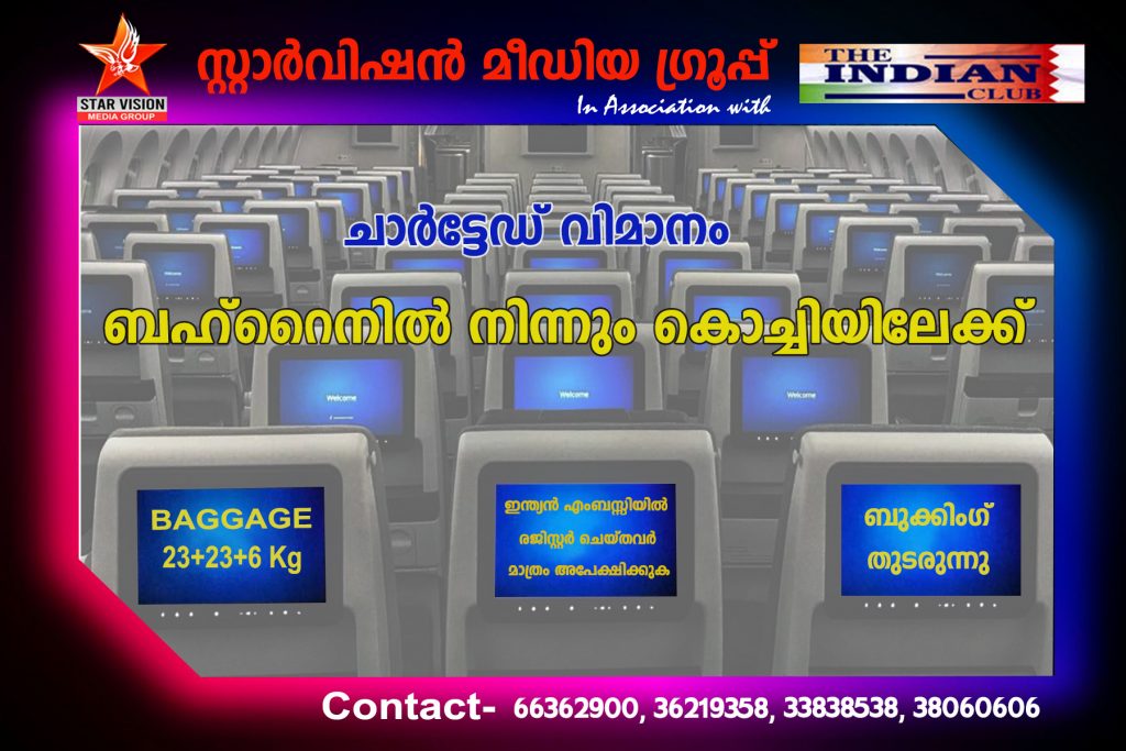 മനാമ: മാധ്യമരംഗത്തും ചാരിറ്റി പ്രവർത്തനങ്ങളിലും ഏറെ സജീവമായി പ്രവർത്തിക്കുന്ന ബഹ്റൈനിലെ സ്റ്റാർ വിഷൻ മീഡിയ ഗ്രൂപ്പ് സാമൂഹിക പ്രതിബദ്ധതയുടെ ഭാഗമായി റിയ ട്രാവൽസുമായി സഹകരിച്ചു കൊച്ചിയിലേക്ക് ചാർട്ടേഡ് വിമാനം ഒരുക്കുന്നു.ഏറ്റവും കുറഞ്ഞ നിരക്കിലാണ് കൊച്ചിയിലേക്ക് ചാർട്ടേർഡ് വിമാനയാത്ര ഒരുക്കുന്നത് ജൂലൈ ആദ്യവാരം ബഹ്റൈനിൽ നിന്നും കൊച്ചിയിലേക്ക് പോകുന്ന വിമാനത്തിൽ യാത്ര ചെയ്യാൻ ആവശ്യമുള്ളവർ 00973-36219358, 66362900,38060606,33838538 എന്നീ നമ്പറുകൾ ബന്ധപ്പെടുക. രജിസ്ട്രേഷനായി താഴെ കാണുന്ന ലിങ്കിൽ ക്ലിക്ക് ചെയ്യുക: