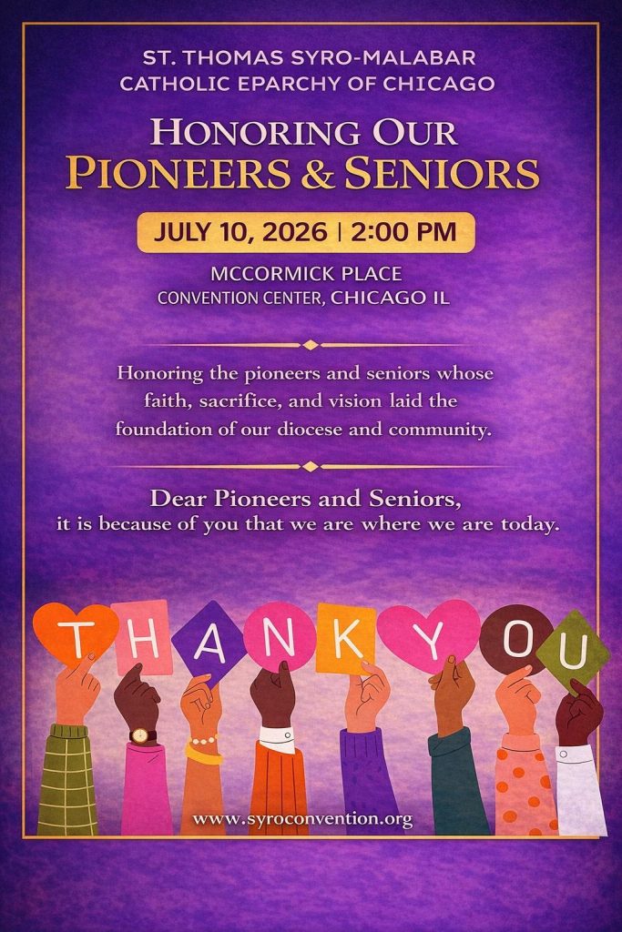 ചിക്കാഗോ : സീറോ മലബാർ ചിക്കാഗോ രൂപതയുടെ ഇരുപത്തിയഞ്ചാം വാർഷികാഘോഷങ്ങളുടെയും രജത ജൂബിലി കൺവെൻഷന്റെയും ഭാഗമായി, രൂപതയുടെ വളർച്ചയ്ക്ക് അടിത്തറപാകിയ പ്രഥമ പ്രവർത്തകരെയും മുതിർന്ന അംഗങ്ങളെയും ആദരിക്കുന്നതിനായി വിപുലമായ ‘മഹാ സംഗമം’ സംഘടിപ്പിക്കുന്നു.