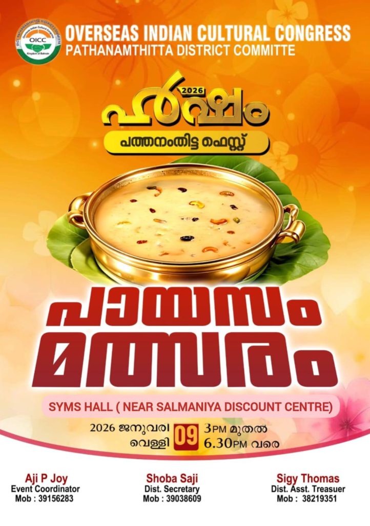 മനാമ: ഒ ഐ സി സി ബഹ്റൈൻ പത്തനംതിട്ട ജില്ലാ കമ്മിറ്റി ഫെബ്രുവരി 6 തീയതി ബഹ്റൈൻ കേരളീയ സമാജത്തിൽ നടത്തുന്ന പത്തനംതിട്ട ഫെസ്റ്റ് “ഹർഷം 2026” ൻ്റെ ഭാഗമായി ഒ ഐ സി സി പത്തനംതിട്ട ജില്ലാ കമ്മിറ്റി വനിതാ വിംഗ് നടത്തുന്ന പായസ മൽസരം ജനുവരി 9 തീയതി വെള്ളിയാഴ്ച്ച വൈകിട്ട് 3 മണി മുതൽ സൽമാനിയായിൽ ഉള്ള സിംസ് ഹാളിൽ വെച്ച് ( സീറോ മലബാർ സോസൈറ്റി) നടക്കുമെന്ന് ഭാരവാഹികൾ അറിയിച്ചു.