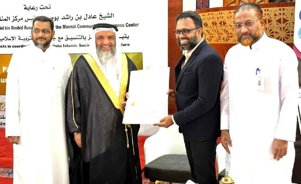 ഉമ്മ് അൽ ഹസ്വം കിംഗ് ഖാലിദ് മസ്ജിദിൽ വെച്ച് നടന്ന ചടങ്ങിൽ തർബിയ ഇസ്ലാമിക് സൊസൈറ്റി നാഷണൽ പ്രോജെക്ട്സ് ഡെപ്യൂട്ടി ഡയറക്ടറും അൽ ഈമാൻ സ്കൂൾസ് ഡയറക്ടറുമായ ഷെയ്ഖ്. റാഷിദ് അബ്ദു റഹ്മാ നിൽ നിന്നും ഡോ. ജൗഹർ മുനവ്വിർ സർട്ടിഫിക്കറ്റ് ഏറ്റു വാങ്ങി.