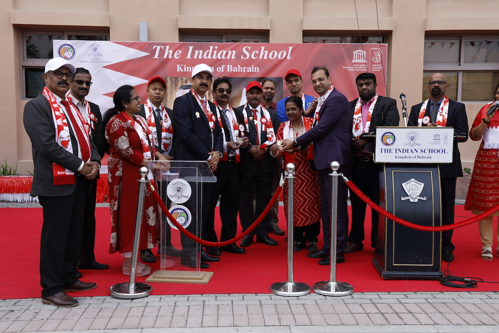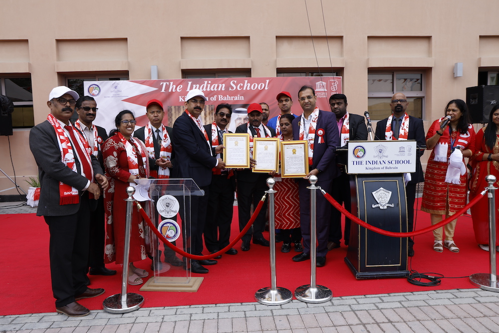 പ്രൈമറി, കിന്റർഗാർട്ടൻ വിഭാഗങ്ങളിൽ നിന്നുള്ള മൊത്തം 3,700 വിദ്യാർത്ഥികൾ ബഹ്റൈൻ ദേശീയ പതാകയുടെ മഹത്തായ മനുഷ്യ രൂപീകരണത്തിൽ പങ്കെടുത്തു. ഇത് ഐക്യം, ദേശീയ അഭിമാനം, രാജ്യത്തോടുള്ള ആദരവ് എന്നിവയെ പ്രതീകപ്പെടുത്തുകയും സ്കൂളിന്റെ പ്ലാറ്റിനം ജൂബിലി ആഘോഷങ്ങൾക്ക് തിളക്കം നൽകുകയും ചെയ്തു. ആഷാത്-അൽ ബഹ്റൈൻ, വി ലവ് ബഹ്റൈൻ, ഹമാര ബഹ്റൈൻ മഹാൻ എന്നിവയായിരുന്നു മുദ്രാവാക്യങ്ങൾ. സ്കൂൾ ചെയർമാൻ അഡ്വ. ബിനു മണ്ണിൽ വറുഗീസ്, സെക്രട്ടറി വി. രാജപാണ്ഡ്യൻ, വൈസ് ചെയർമാനും സ്പോർട്സ് അംഗവുമായ ഡോ. മുഹമ്മദ് ഫൈസൽ, അക്കാദമിക്സ് അംഗം രഞ്ജിനി മോഹൻ, ഫിനാൻസ് & ഐടി അംഗം ബോണി ജോസഫ്, പ്രോജക്ട് & മെയിന്റനൻസ് അംഗം മിഥുൻ മോഹൻ, ട്രാൻസ്പോർട്ട് അംഗം മുഹമ്മദ് നയാസ് ഉല്ല, പ്രിൻസിപ്പൽ വി.ആർ. പളനിസ്വാമി, ജൂനിയർ വിംഗ് പ്രിൻസിപ്പൽ പമേല സേവ്യർ, സീനിയർ സ്കൂൾ & അക്കാദമിക് അഡ്മിനിസ്ട്രേഷൻ വൈസ് പ്രിൻസിപ്പൽ ജി. സതീഷ്, ജൂനിയർ വിംഗ് വൈസ് പ്രിൻസിപ്പൽ പ്രിയ ലാജി എന്നിവർക്കൊപ്പം മന്ത്രാലയ ഉദ്യോഗസ്ഥരും ചടങ്ങിൽ പങ്കെടുത്തു. പ്രിൻസിപ്പൽ പമേല സേവ്യർ സ്വാഗത പ്രസംഗം നടത്തി. തുടർന്ന് ദേശീയ ദിന സന്ദേശം അഡ്വ. ബിനു മണ്ണിൽ വർഗീസ് നൽകി .