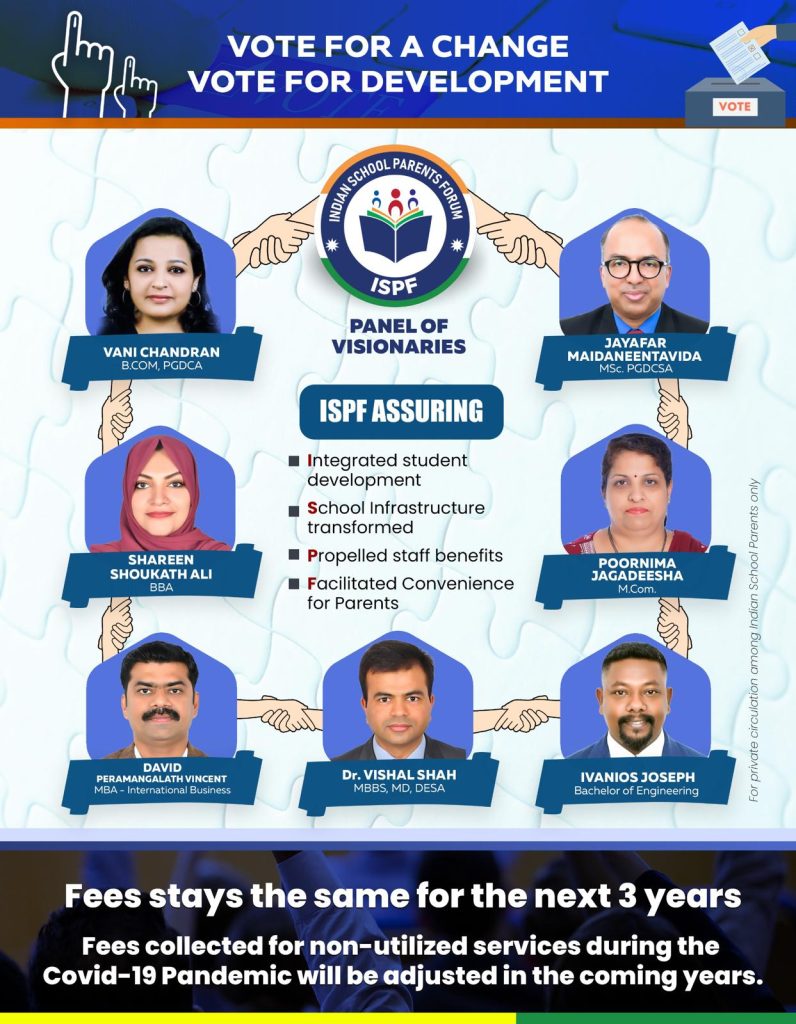ഇന്ത്യൻ സ്കൂളിന്റെ സമഗ്ര പരിഷ്കരണം ലക്ഷ്യമിട്ടു പ്രവർത്തിക്കാൻ വാണി ചന്ദ്രൻ ,ജെയ്ഫെർ മൈദനീന്റവിട ,ഷെറിൻ ഷൗക്കത്തലി ,ഡോക്ടർ വിശാൽ ഷാ ,ഇവാനിയോസ് ജോസഫ് ,പൂർണിമ ജഗദീശ ,ഡേവിഡ് പേരമംഗലത് തുടങ്ങിയവരെ സ്ഥാനാത്ഥികളാക്കി മത്സരിക്കാൻ തീരുമാനിച്ചു.തങ്ങൾ അധികാരത്തിൽ വരുന്നപക്ഷം,കോവിഡ് കാലത്തു പിരിച്ച ഉപയോഗിച്ചിട്ടില്ലാത്ത സേവനത്തിനുള്ള ഫീസുകൾ വരും വർഷങ്ങളിൽ തവണകളായി അടക്കാനുള്ള ഫീസിൽ അഡ്ജസ്റ്റ് ചെയ്യുമെന്നും വരുന്ന മൂന്നു വർഷങ്ങളിൽ ഒരു ഫീസ് വർദ്ധനയും ഉണ്ടാവില്ലെന്ന് അറിയിച്ചു.പക്ഷപാതമില്ലാതെ അർഹരായ എല്ലാ വിദ്യാർത്ഥികൾക്കും പ്രവേശനം,ന്യൂതന ഡിജിറ്റൽ പഠനമുറികൾ,ശുചിത്വവും ആധുനികതയും ഒത്തിണങ്ങിയ ക്യാന്റീൻ സംവിധാനം,വൃത്തിയും വെടിപ്പുമുള്ള ശുചിമുറികൾ ,വനിതാ നീന്തൽ പരിശീലകർ,അധ്യാപകർക്ക് ആരോഗ്യ ഇൻഷുറൻസും വാർഷിക ശമ്പളവർധനയും,ഉന്നത വിദ്യാഭ്യാസകേന്ദ്രവും എൻട്രൻസ് പരിശീലന സംവിധാനവും,സമൂഹത്തിന്റെ കൂടി സഹകരണത്തോടെ ടാഗോർ ബ്ലോക്ക് നവീകരണം ,ക്രെഡിറ്റ് കാർഡ് ഉപയോഗിച്ചുള്ള ഫീസ് പയ്മെന്റ്റ്,സഹായത്തിനായി 24 മണിക്കൂർ ഹോട്ട് ലൈൻ സേവനം തുടങ്ങി ഈ പുതിയ കാലഘട്ടത്തിനു വേണ്ട എല്ലാ വികസന പ്രവർത്തനങ്ങളും ഘട്ടം ഘട്ടമായി നടപ്പിൽ വരുത്താൻ ഈ പാനൽ പ്രതിഞ്ജാബദ്ധമാണെന്നും ISPF പ്രവർത്തന സമിതി അറിയിച്ചു.