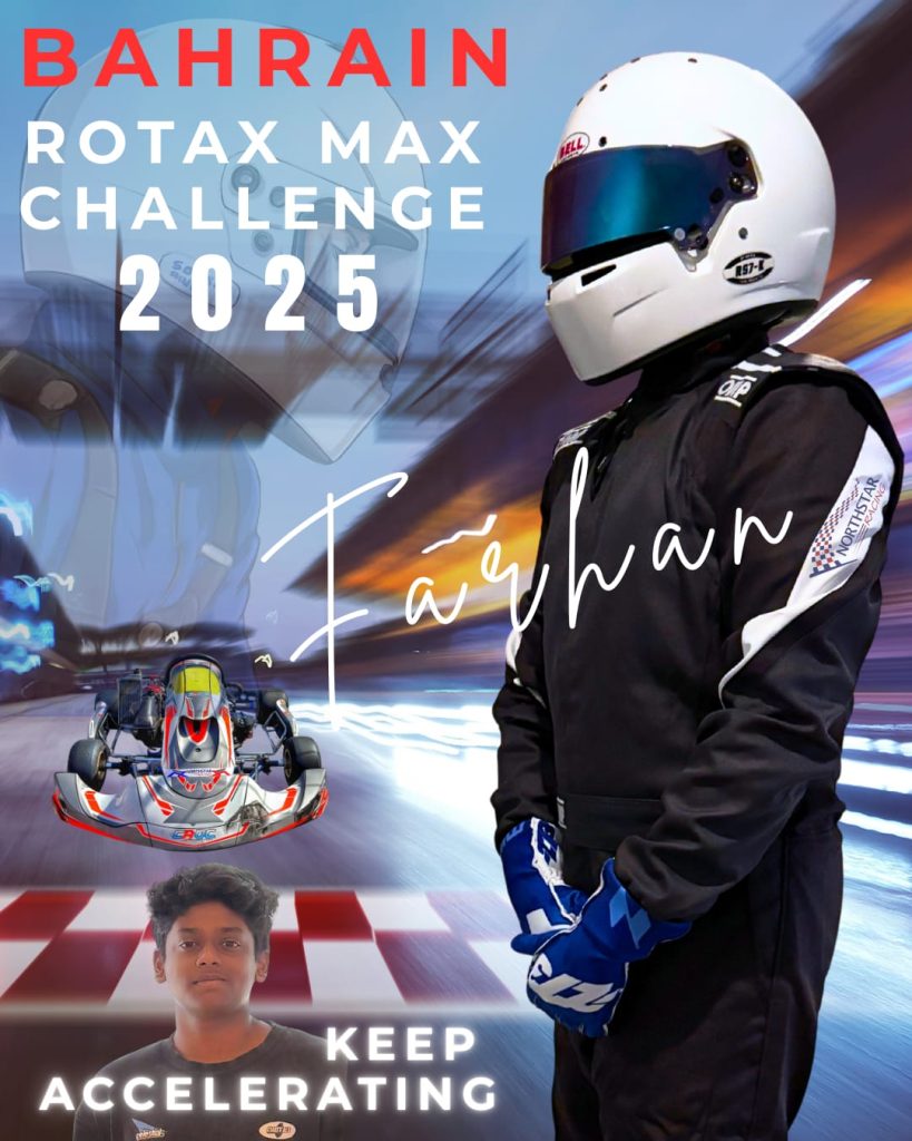മനാമ: ഇന്ത്യക്കാരനും ബഹ്റൈനിൽ താമസക്കാരനുമായ14കാരനായ ഫർഹാൻ ബിൻ ഷഫീൽ മോട്ടോർസ്പോർട്സ് ലോകത്തേക്ക് ശക്തമായ പ്രവേശനം നടത്തുകയാണ്. ഇന്ത്യൻ സ്കൂൾ ബഹ്റൈനിൽ എട്ടാം ക്ലാസ് വിദ്യാർത്ഥിയായ ഫർഹാൻ, പ്രൊഫഷണൽ കാർട്ടിങ് ടീമായ നോർത്ത്സ്റ്റാർ റേസിങ്ങിനൊപ്പം കഠിന പരിശീലനത്തിലാണ്. ബഹ്റൈൻ ശാകിർ ഇന്റർനാഷണൽ കാർട്ടിംഗ് സർക്യൂട്ടിൽ വെച്ചു നടക്കുന്ന Rotax Max ചാലഞ്ചിലെ സീനിയർ മാക്സ് വിഭാഗത്തിലാണ് പങ്കെടുകുന്നത്.