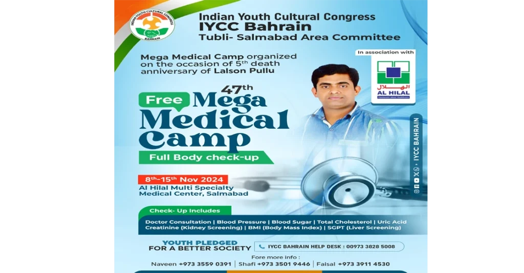 മനാമ : ഐ.വൈ.സി.സി ബഹ്റൈൻ മുൻ ട്യൂബ്ലി – സൽമാബാദ് ഏരിയ പ്രസിഡന്റും, ദേശീയ കമ്മിറ്റി എക്സിക്യൂട്ടീവ് അംഗവും ആയിരുന്ന തൃശൂർ പുള്ള് സ്വദേശി ലാൽസൺ പുള്ളിന്റെ അഞ്ചാം ചരമ വാർഷികത്തോട് അനുബന്ധിച്ച് സൗജ്യന മെഡിക്കൽ ക്യാമ്പ് സംഘടിപ്പിക്കുന്നു.