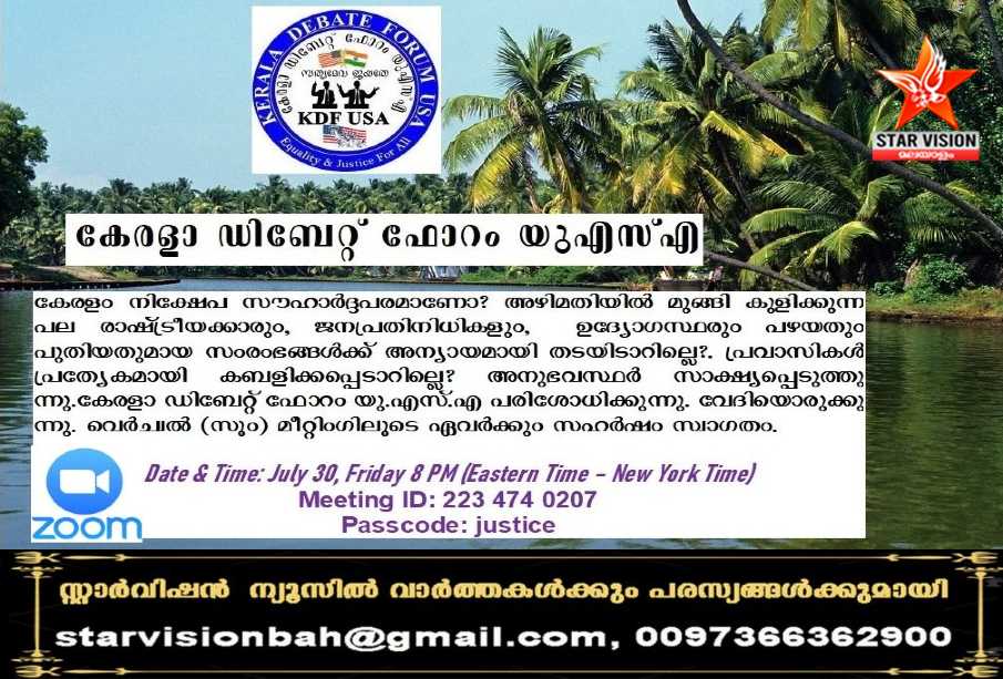 ഈയിടെ നടമാടുന്ന കിറ്റക്സ് കമ്പനി വിവാദവും ഒരുദാഹരണമായി കാണിക്കാവുന്നതാണ്. ഇത്തരത്തില് വെളിച്ചത്തു പോലും വരാത്ത ധാരാളം സംഭവങ്ങള് ഇന്ത്യയില് കേരളത്തില് പ്രത്യേകിച്ചും നടമാടുന്നു. രാഷ്ട്രീയ, ഉദ്യോഗസ്ഥ, അഴിമതി മറ്റു മാനസിക പീഡനങ്ങള്ക്കും ഇരയായ പ്രവാസികള്ക്കും, സ്വദേശികള്ക്കും ആര്ക്കും ഈ സംവാദത്തില് പങ്കെടുത്ത് പ്രതികരിക്കാം. അതിനെതിരെ പരിഹാരങ്ങള് നിര്ദേശിക്കാം. കക്ഷിഭേദമെന്യേ നേതാക്കള്ക്കും പൊതുജനങ്ങള്ക്കും ഇതില് പങ്കെടുക്കാം. എന്നാല് എല്ലാവര്ക്കും തുല്യസമയവും പരിഗണനയുമാണിവിടെ സംവാദത്തില് നല്കുന്നത്. കേരളാ ഡിബേറ്റ് ഫോറം, യുഎസ്എയില് പ്രത്യേകം ഭാരവാഹികളില്ലാ. പ്രവര്ത്തക വാളണ്ടിയേഴ്സ് മാത്രം. ഓരോ ഭാരവാഹികളുടെയും അന്യോന്യമുള്ള അപദാനങ്ങള് പ്രകീര്ത്തിച്ച് കൊണ്ടുള്ള നീണ്ട പരിചയപെടുത്തലുകളോ പ്രഭാഷണങ്ങളോ ഇവിടെ ഉണ്ടാകുകയില്ല. ആര്ക്കും ഈ നിരീക്ഷണ വെര്ച്വല് യോഗത്തില് പങ്കെടുക്കാവുന്നതാണ്.