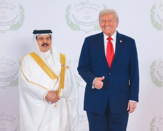 ഷറം അല് ഷെയ്ഖ്: ഈജിപ്തിലെ ഷറം അല് ഷെയ്ഖില് നടക്കുന്ന സമാധാന ഉച്ചകോടിയില് പങ്കെടുക്കുന്നതിനിടയില് അമേരിക്കന് പ്രസിഡന്റ് ഡൊണാള്ഡ് ട്രംപുമായി ബഹ്റൈന് രാജാവ് ഹമദ് ബിന് ഈസ അല് ഖലീഫ കൂടിക്കാഴ്ച നടത്തി.