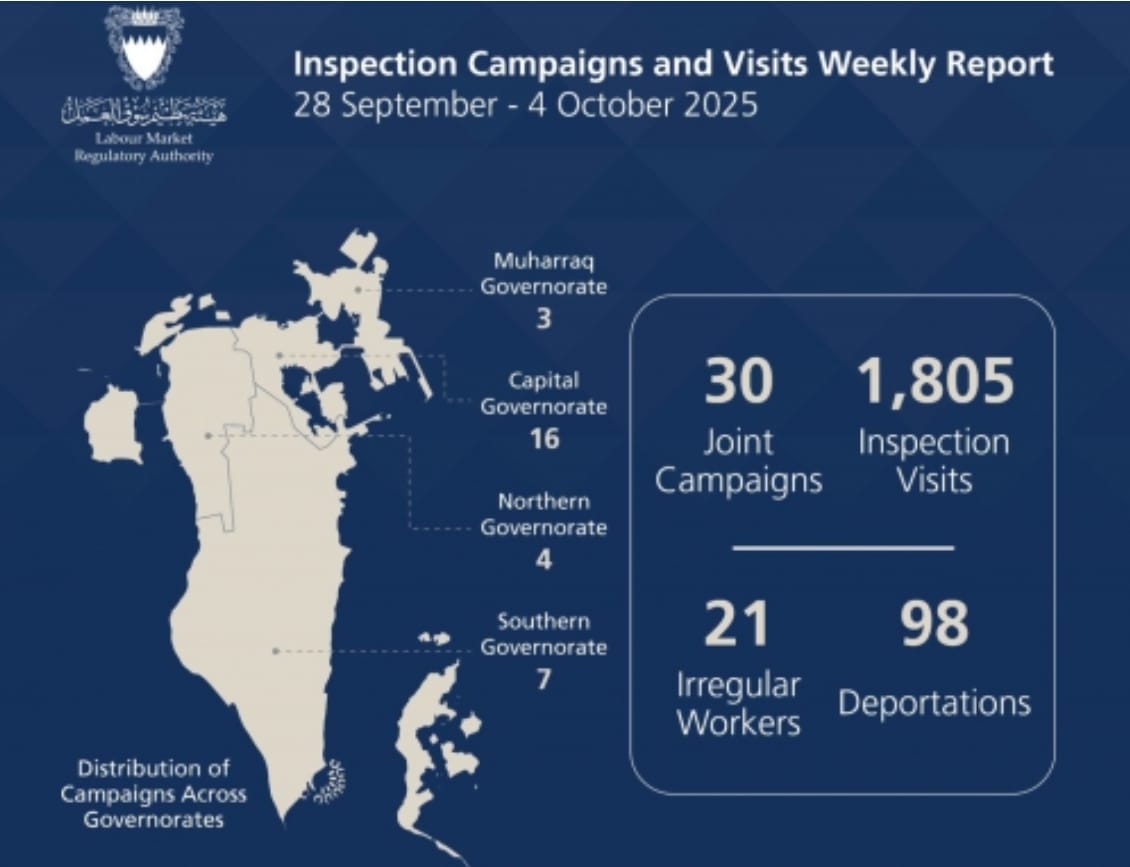 മനാമ: സെപ്റ്റംബര് 28നും ഒക്ടോബര് നാലിനുമിടയില് ബഹ്റൈനിലുടനീളം നടത്തിയ പരിശോധനകളില് കണ്ടെത്തിയ 98 അനധികൃത വിദേശ തൊഴിലാളികളെ നാടുകടത്തിയതായി ലേബര് മാര്ക്കറ്റ് റെഗുലേറ്ററി അതോറിറ്റി (എല്.എം.ആര്.എ) അറിയിച്ചു.