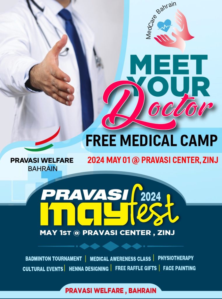 മനാമ: ലോക തൊഴിലാളി ദിനത്തോടനുബന്ധിച്ച് മെയ് ഒന്നിന് സിഞ്ചിലുള്ള പ്രവാസി സെൻററിൽ പ്രവാസി വെൽഫെയർ സംഘടിപ്പിക്കുന്ന മെയ് ഫെസ്റ്റിൻ്റെ ഭാഗമായി മെഡ്കെയറിൻ്റെ നേതൃത്വത്തിൽ മീറ്റ് യുവർ ഡോക്ടർ എന്ന പേരിൽ വീണ്ടും സൗജന്യ ആരോഗ്യ പരിശോധന ക്യാമ്പ് സംഘടിപ്പിക്കുന്നു.