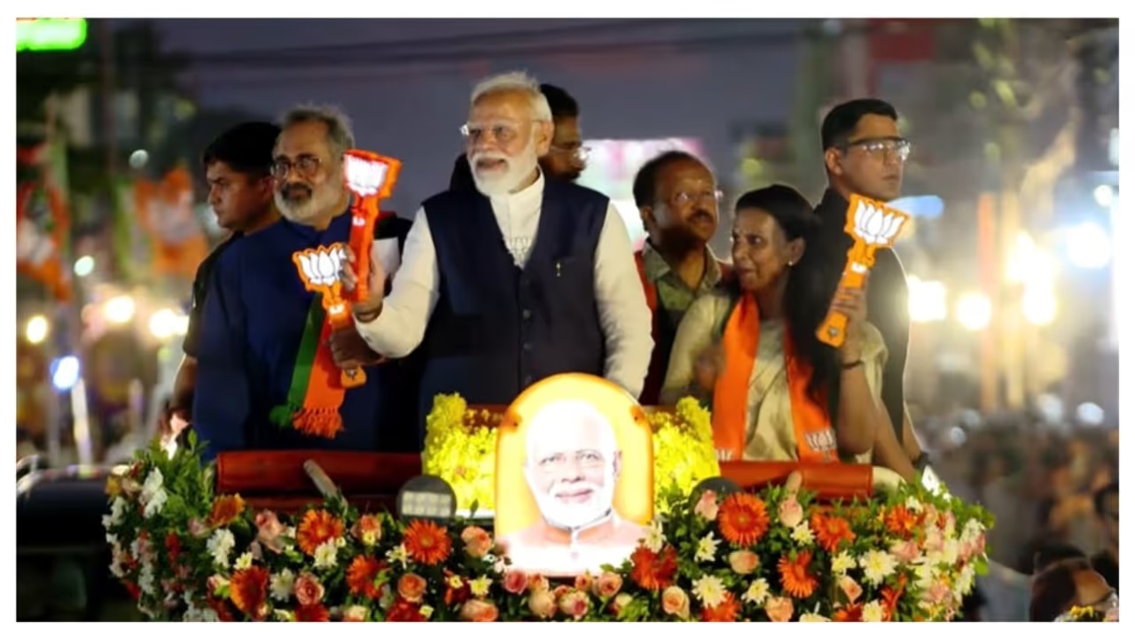 തിരുവനന്തപുരം: എൻഡിഎ ക്യാംപിന് ആവേശമായി പ്രധാനമന്ത്രി നരേന്ദ്ര മോദി തിരുവനന്തപുരത്ത്. ഇന്ന് വൈകുന്നേരത്തോടെ കേരളത്തിലെത്തിയ മോദി തിരുവല്ലയിലെ ആദ്യപരിപാടിക്ക് ശേഷമാണ് തലസ്ഥാന നഗരത്തിലെത്തിയത്. കരമന മുതൽ കിള്ളിപ്പാലം വരെയുള്ള റോഡ് ഷോയിൽ മോദി പങ്കെടുത്തു. മോദിക്കൊപ്പം 4 മണ്ഡലങ്ങളിലെ സ്ഥാനാർത്ഥികളും ഉണ്ടായിരുന്നു. തിരുവനന്തപുരം, നേമം മണ്ഡലങ്ങളിലൂടെയായിരുന്നു റോഡ് ഷോ. രാജീവ് ചന്ദ്രശേഖർ, വി മുരളീധരൻ, ശ്രീലേഖ, കരമന ജയൻ എന്നീ സ്ഥാനാര്ത്ഥികളാണ് പ്രധാനമന്ത്രിക്കൊപ്പം റോഡ് ഷോയിൽ പങ്കെടുത്തത്. റോഡിന്റെ ഇരുവശവും പ്രധാനമന്ത്രിയെ കാണാൻ ജനങ്ങള് തിങ്ങിക്കൂടുന്ന കാഴ്ചയാണ് കാണാൻ സാധിച്ചത്. തിരുവല്ലയിൽ പൊതുയോഗത്തിൽ മോദി ജനങ്ങളെ അഭിസംബോധന ചെയ്ത് സംസാരിച്ചിരുന്നു. ഇവിടെ പൊതുയോഗമില്ല. പൂക്കളുമായിട്ടാണ് ജനങ്ങള് റോഡിനിരുവശവും പ്രധാനമന്ത്രിയെ കാത്തുനിന്നത്. തുറന്ന വാഹനത്തിൽ വളരെ പതിയെ ആണ് പ്രധാനമന്ത്രിയുടെ വാഹനം സഞ്ചരിച്ചത്.