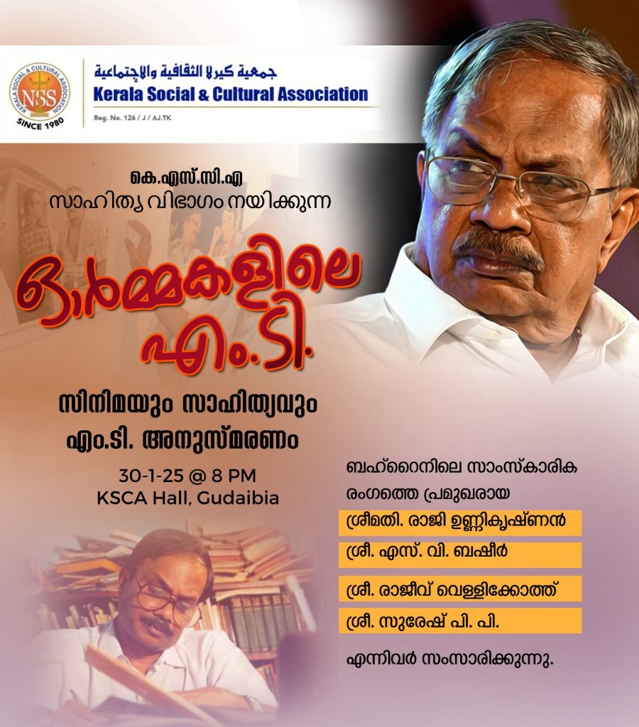 കേരളാ സോഷ്യൽ ആൻഡ് കൾച്ചറൽ അസോസിയേഷൻ, ബഹ്റൈൻ (കെ.എസ്.സി.എ) സാഹിത്യ വിഭാഗം നയിക്കുന്ന എം.ടി. വാസുദേവൻ നായർ അനുസ്മരണം, “ഓർമ്മകളിലെ എം.ടി. – സിനിമയും സാഹിത്യവും” എന്ന വിഷയത്തിൽ ഒരു സംസാരസാഗരം ഒരുക്കുന്നു.