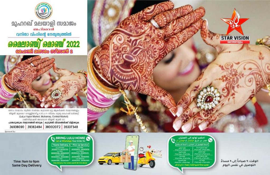മനാമ: മുഹറഖ് മലയാളി സമാജം വനിത വിംഗ് നേതൃത്വത്തിൽ മൈലാഞ്ചി മൊഞ്ച് സീസൺ 2 മെഹന്തി മത്സരം സംഘടിപ്പിക്കുന്നു, ജൂലായ് 1 വെള്ളിയാഴ്ച മുഹറഖ് ലുലു ഹൈപ്പർ മാർക്കറ്റ് ഗ്രൗണ്ട് ഫ്ലോറിൽ വെച്ചാണ് മത്സരം നടക്കുന്നത്, മത്സരത്തിൽ പങ്കെടുക്കാനും കൂടുതൽ വിവരങ്ങൾക്കും വിളിക്കുക 36938090, 39382484, 38002072, 35337348.