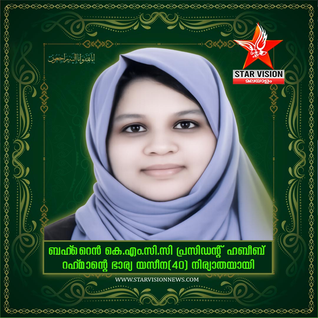 മനാമ: ബഹ്റൈന് കെ.എം.സി.സി. സംസ്ഥാന പ്രസിഡന്റ് ഹബീബ് റഹ്മാന്റെ ഭാര്യ യസീന ഹബീബ് (40) ബഹ്റൈനില് ഹൃദയാഘാതം മൂലം നിര്യാതയായി.
