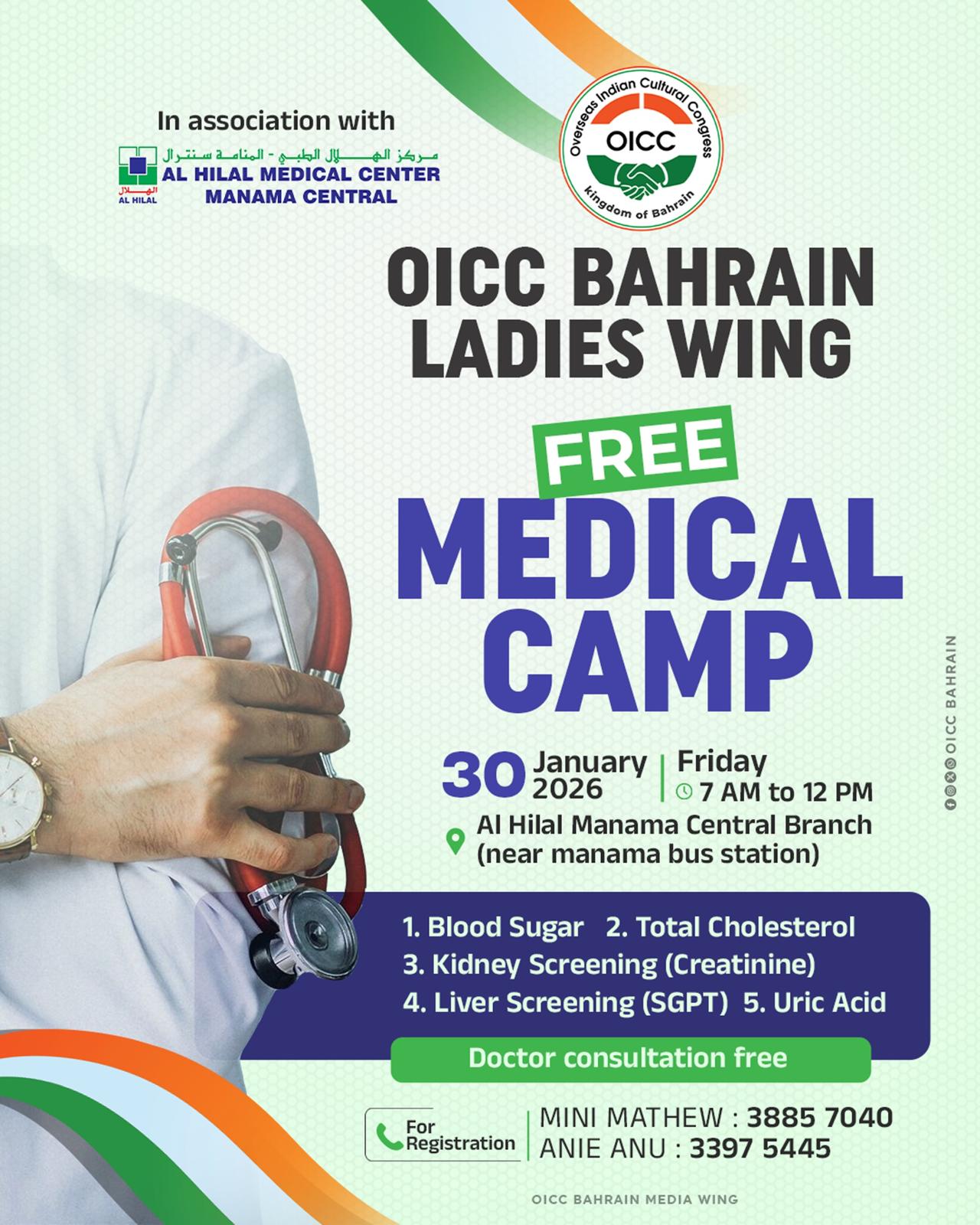മനാമ : ബഹ്റൈൻ ഒഐസിസി വനിതാ വിഭാഗം ഇന്ത്യയുടെ രാഷ്ട്രപിതാവ് മഹാത്മാ ഗാന്ധി യുടെ രക്തസാക്ഷിത്വദിന അനുസ്മരണത്തോട് അനുബന്ധിച്ച് അൽ ഹിലാൽ മെഡിക്കൽ സെന്റർ ന്റെ സഹകരണത്തോടെ അൽ ഹിലാൽ മെഡിക്കൽ സെന്റർ മനാമ സെൻട്രൽ ൽ വച്ച് ജനുവരി 30 വെള്ളിയാഴ്ച രാവിലെ 7മണി മുതൽ ഉച്ചക്ക് 12 മണി വരെ സൗജന്യ മെഡിക്കൽ ക്യാമ്പ് നടത്തുന്നതാണ് എന്ന് ഒഐസിസി വനിതാ വിഭാഗം ദേശീയ കമ്മറ്റി വാർത്താകുറിപ്പിലൂടെ അറിയിച്ചു.സൗജന്യ ഡോക്ടർ കൺസൽട്ടേഷനോടൊപ്പം സൗജന്യ രക്ത പരിശോധനയുടെ ഭാഗമായി ബ്ലഡ് ഷുഗർ, ടോട്ടൽ കൊളസ്ട്രോൾ, കിഡ്നി സ്ക്രീനിംഗ്, ലിവർ സ്ക്രീനിങ്, യൂറിക് ആസിഡ് മുതലായവയുടെ പരിശോധനയും ഉണ്ടായിരിക്കും. കൂടുതൽ വിവരങ്ങൾക്ക് മിനി മാത്യു ( 38857040) ആനി അനു ( 33975445) എന്നി നമ്പറുകളിൽ അറിയുവാൻ സാധിക്കും.