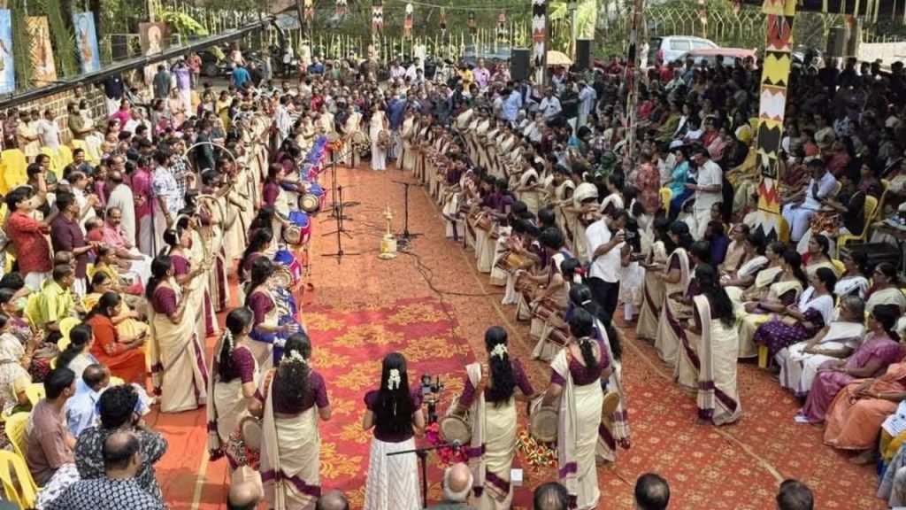 തൃശൂർ: എടപ്പാള് സോപാനം സ്കൂള് ഓഫ് പഞ്ചവാദ്യത്തിന്റെ ആഭിമുഖ്യത്തില് വനിതാ ദിനത്തില് സമ്പൂര്ണ്ണ വനിതാ പഞ്ചവാദ്യം അരങ്ങേറി. എടപ്പാൾ സോപാനം സ്കൂൾ ഓഫ് പഞ്ചവാദ്യത്തിന്റെ ആഭിമുഖ്യത്തിൽ നടന്ന പരിപാടിയിൽ പത്തു വയസ്സുകാരി മുതൽ 74 വയസ്സുകാരി വരെ നീളുന്ന 75 അംഗ വനിതാ സംഘമാണ് മാസ്മരിക പ്രകടനം കാഴ്ചവെച്ചത്. 21 തിമില, 10 മദ്ദളം, 8 ഇടയ്ക്ക, 14 കൊമ്പ്, 21 ഇലത്താളം, ഒരു ശംഖ് എന്നിങ്ങനെ 75 പേർ അണിനിരന്ന സംഘം ഒന്നര മണിക്കൂർ നീളുന്ന പഞ്ചവാദ്യമാണ് അവതരിപ്പിച്ചത്.