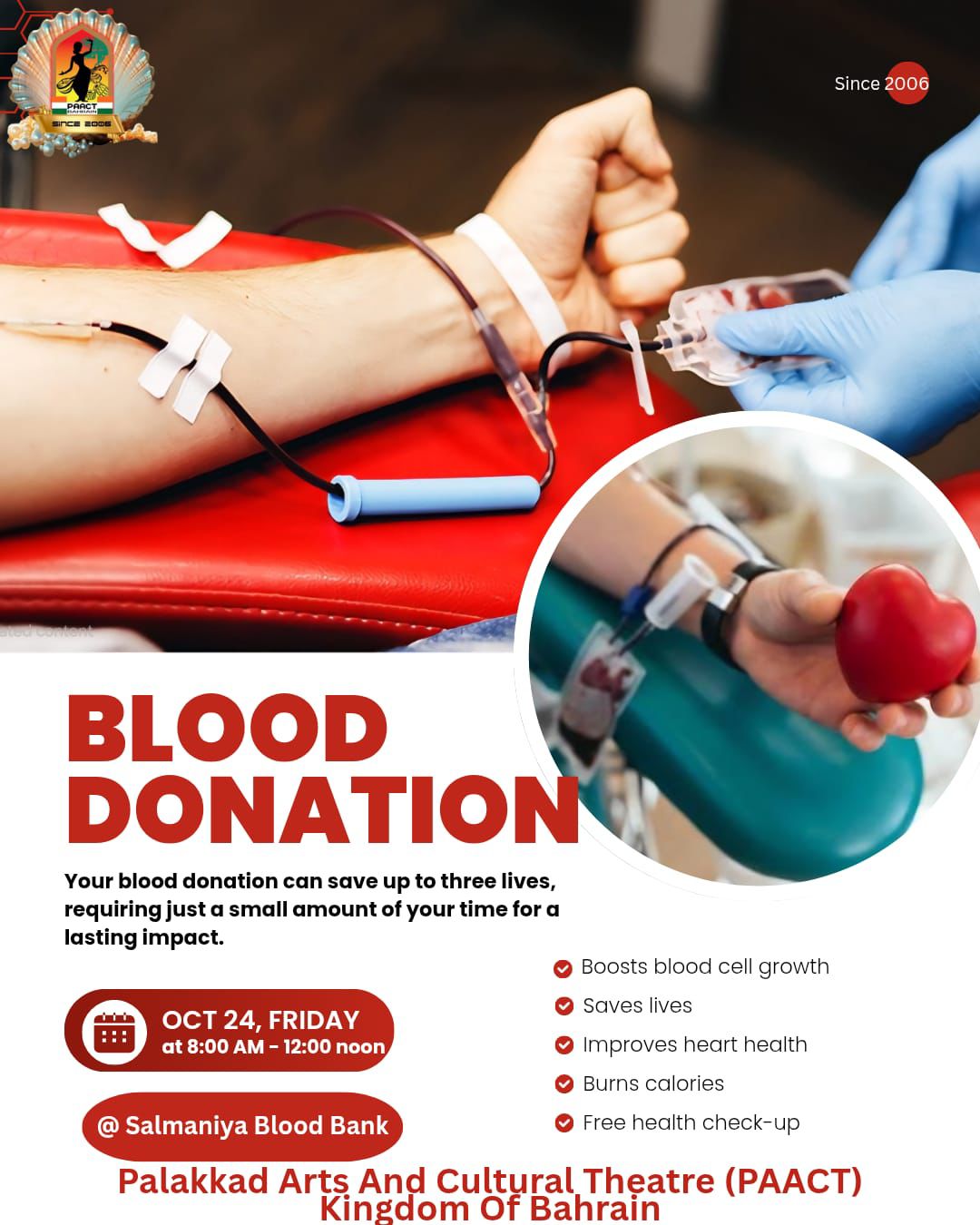 പാലക്കാട് ആർട്സ് ആൻഡ് കൾച്ചറൽ തിയേറ്റർ(പാക്ട് )സംഘടിപ്പിക്കുന്ന രക്ത ദാന ക്യാമ്പ് വെള്ളിയാഴ്ച്ച (24.10.2025) രാവിലെ 8 മുതൽ 12 വരെ സൽമാനിയ മെഡിക്കൽ കോംപ്ലക്സ്കിൽ വെച്ച് നടക്കുമെന്ന് ഭാരവാഹികൾ അറിയിച്ചു. പങ്കെടുക്കാൻ ആഗ്രഹിക്കുന്നവർ താഴെ കാണുന്ന നമ്പറിൽ ബന്ധപ്പെടണം 3987 1460 ,3914 3350 ,39143967.