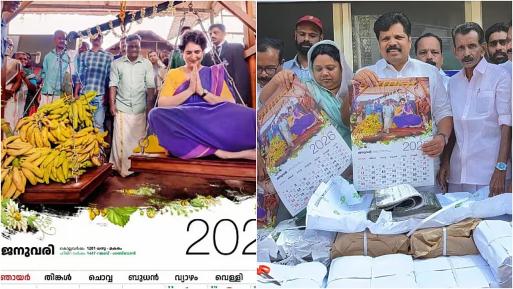 കൽപ്പറ്റ: പുതുവർഷ കലണ്ടറുമായി വയനാട് എംപി പ്രിയങ്കാ ഗാന്ധി. വയനാടിനെ പ്രമേയമാക്കി പ്രിയങ്കയുടെ ചിത്രങ്ങൾ ഉപയോഗിച്ചാണ് കോൺഗ്രസ് പാർട്ടി കലണ്ടർ പുറത്തിറക്കിയത്. പ്രിയങ്ക എംപിയായിട്ട് ഒരുവർഷമാകുന്നുവെന്നും എംപിയായതിന് ശേഷമുള്ള പുതുവത്സരമാണെന്നും നേരത്തെ രാഹുൽ ഗാന്ധിയുടെ ചിത്രങ്ങൾ ഉപയോഗിച്ചും കലണ്ടർ പുറത്തിറക്കിയിരുന്നുവെന്നും ചടങ്ങിൽ വണ്ടൂർ എംഎൽഎ എപി അനിൽകുമാർ പറഞ്ഞു. എംപി സ്ഥാനത്ത് എത്തിയതിന് ശേഷം വയനാട്ടിൽ പ്രിയങ്കാ ഗാന്ധി നടത്തിയ യാത്രകളടക്കമാണ് ചിത്രരൂപത്തിൽ കലണ്ടറിൽ പ്രദർശിപ്പിച്ചിരിക്കുന്നത്.