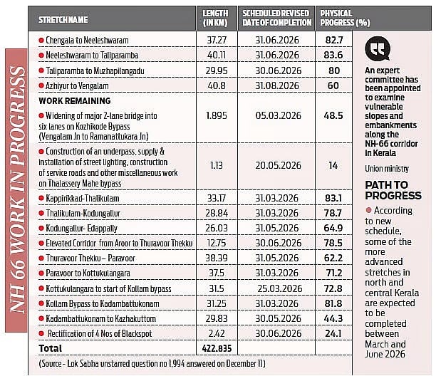 പുതുക്കിയ ഷെഡ്യൂള് അനുസരിച്ച്, വടക്കന്, മധ്യ കേരളത്തിലെ ചില പാതകള് 2026 മാര്ച്ച് മുതല് ജൂണ് വരെയുള്ള കാലങ്ങളില് പൂര്ത്തിയാകുമെന്നാണ് അറിയിച്ചിരിക്കുന്നത്. കോഴിക്കോട്, മധ്യ കേരളത്തിലെ ചിലഭാഗങ്ങളിലെ റീച്ചുകള്ക്ക് 2026 ഓഗസ്റ്റ് വരെ സമയപരിധിയുണ്ട്. കുറഞ്ഞ പുരോഗതി കാണിക്കുന്ന റീച്ചുകളില് സുരക്ഷയും ഗുണനിലവാരവും ഉറപ്പാക്കാന് സമയപരിധി നീട്ടിനല്കിയിട്ടുണ്ട്. വീഴ്ചകള് പരിശോധിക്കാന് സൂക്ഷ്മ നിരീക്ഷണ സംവിധാനങ്ങള് ഇപ്പോള് നിലവിലുണ്ടെന്നും ദേശീയ പാതാ അതോറിറ്റി പറയുന്നു.