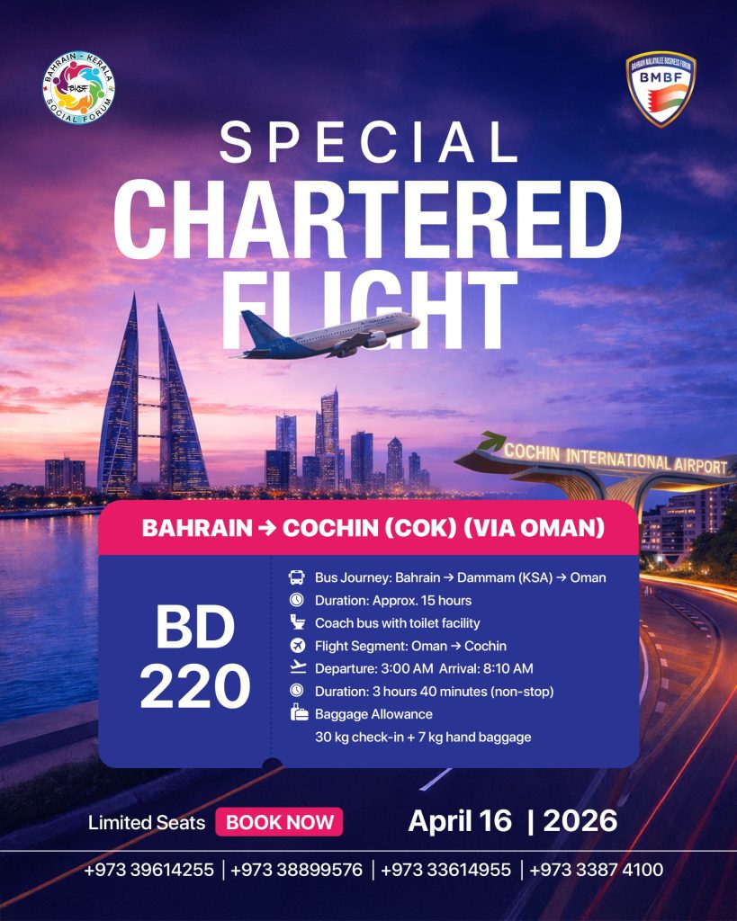 ഇതിനു വേണ്ടിയിട്ടുള്ള ചാര്ട്ടേഡ് വിമാനം ഏപ്രില് 16ന് മസ്ക്കത്തില്നിന്ന് പുറപ്പെടും. യാത്രക്കാരെ ബഹ്റൈനില്നിന്ന് സൗദി വഴി ഒമാനിലെ മസ്ക്കത്ത് എയര്പോര്ട്ടിലേക്ക് ബസ് മാര്ഗവും അവിടെ നിന്ന് കൊച്ചിയിലേക്ക് വിമാനമാര്ഗവും കൊണ്ടുപോകും. ഇതിനെല്ലാം കൂടി 220 ബഹ്റൈന് ദിനാറാണ് നല്കേണ്ടത്.