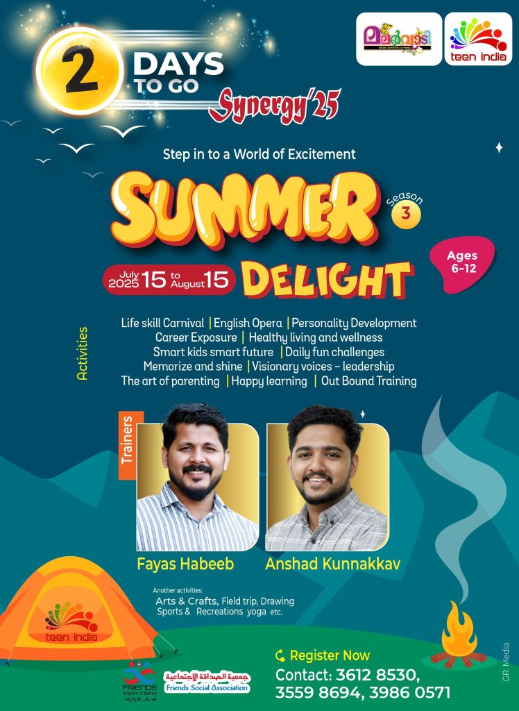 മനാമ: ഫ്രൻഡ്സ് സോഷ്യൽ അസോസിയേഷൻ സംഘടിപ്പിക്കുന്ന സമ്മർ ക്യാമ്പായ സമ്മർ ഡിലൈറ്റ് സീസൺ മൂന്നിന്റെ ഒരുക്കങ്ങൾ പൂർത്തിയായതായി ഭാരവാഹികൾ അറിയിച്ചു. ജൂലൈ 15 മുതൽ ഓഗസ്റ്റ് 15 വരെ നീണ്ടുനിൽക്കുന്ന സമ്മർ ക്യാമ്പ് ആറ് വയസ്സ് മുതൽ 12 വയസ്സു വരെയുള്ള കുട്ടികൾക്കാണ് ഒരുക്കിയിട്ടുള്ളത്. നാട്ടിൽ നിന്നും കഴിവുറ്റ ട്രെയിനർമാരുടെ മേൽനോട്ടത്തിലും പരിശീലനം സിദ്ധിച്ച മെന്റർമാരുടെ സഹായത്തോടെയും നടത്തുന്ന ക്യാമ്പിൽ വിവിധ വിഷയങ്ങളിൽ ഉള്ള ഗൈഡൻസുകളും, അറിവുകളും, ഗെയിമുകളും കുട്ടികൾക്ക് ഭാവിയിലേക്ക് ഗുണകരമാകുന്ന മൂല്യവത്തായ സെഷനുകളും ഒരുക്കിയിട്ടുണ്ട്. പ്രമുഖ യുവ ട്രെയിനർമാരും ലൈഫ് കോച്ചുമാരായ ഫയാസ് ഹബീബും അൻഷദ് കുന്നക്കാവും ആണ് കേമ്പിന് നേതൃത്വം നൽകുന്നത്. കഴിഞ്ഞ രണ്ടു വർഷങ്ങളിൽ വിജയകരമായി സമ്മർ ക്യാമ്പ് സംഘടിപ്പിക്കാൻ സാധിച്ചിട്ടുണ്ടെന്നും അതിൻ്റെ പിൻബലത്തിൽ ഇക്കുറിയും വിപുലമായ രൂപത്തിലാണ് ക്യാമ്പ് സംഘടിപ്പിക്കുന്നതെന്നും കൺവീനർ അനീസ് വി. കെ വ്യക്തമാക്കി. ബഹ്റൈൻ്റെ വിവിധ ഭാഗങ്ങളിൽ നിന്ന് വാഹന സൗകര്യവും ഒരുക്കിയിട്ടുണ്ട്. ഏതാനും സീറ്റുകൾ കൂടി ബാക്കിയുണ്ടെന്നും താൽപര്യമുള്ളവർക്ക് 39593782, 36128530 എന്നീ നമ്പരുകളിൽ ബന്ധപ്പെട്ട് ഉടനെ രജിസ്റ്റർ ചെയ്യാവുന്നതാണെും കോർഡിനേറ്റർ സജീബ് അറിയിച്ചു.