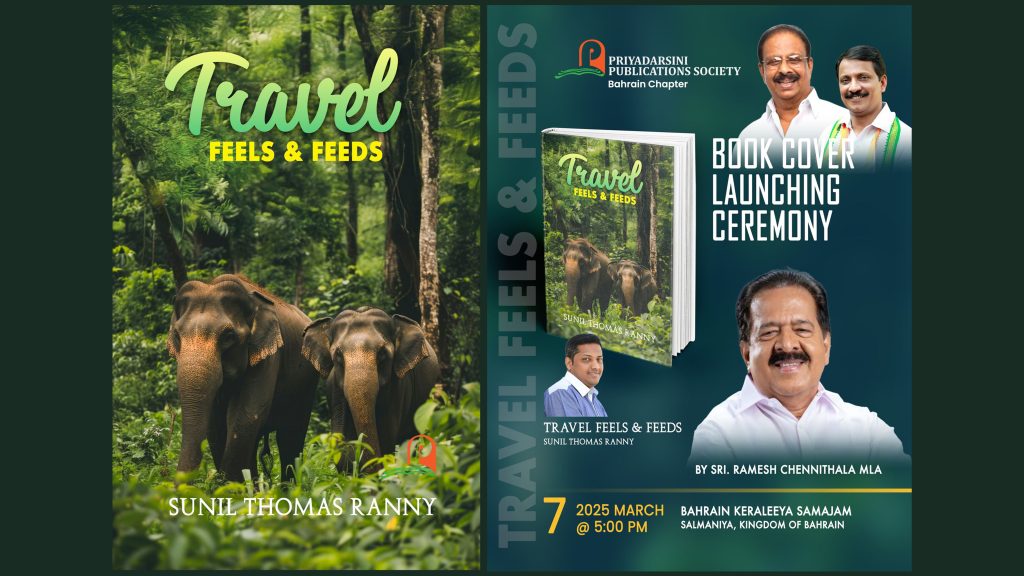 മനാമ: കെപിസിസിയുടെ പ്രസിദ്ധീകരണ വിഭാഗമായ പ്രിയദർശിനി പബ്ലിക്കേഷൻസ് സൊസൈറ്റിയുടെ പ്രസിദ്ധീകരണത്തിൽ പുതിയ പുസ്തകം ബഹ്റൈൻ പ്രവാസി സുനിൽ തോമസ് റാന്നി എഴുതുന്ന ആദ്യ പുസ്തകം ട്രാവൽ ഫീൽസ് ആൻഡ് ഫീഡ്സ് കവർപേജ് റിലീസ് ബഹറിൻ കേരളീയ സമാജത്തിൽ വച്ച് മുൻ പ്രതിപക്ഷ നേതാവ് രമേശ് ചെന്നിത്തല എംഎൽഎ സമാജം പ്രസിഡൻറ് പി വി രാധാകൃഷ്ണപിള്ളയ്ക്ക് നൽകി പ്രകാശനം ചെയ്തു.