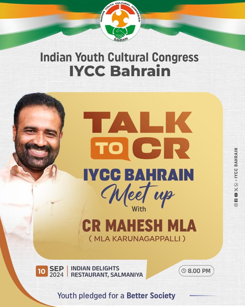 മനാമ : കരുനാഗപ്പള്ളി എം.എൽ.എ യും, കോൺഗ്രസ് നേതാവുമായ സി.ആർ മഹേഷ് എം.എൽ.എ യും, ഐ.വൈ.സി.സി ബഹ്റൈൻ പ്രവർത്തകരുമായുള്ള കൂടിക്കാഴ്ച്ച ഇന്ന് രാത്രി 8.00 മണിക്ക് സൽമാനിയ ഇന്ത്യൻ ഡിലൈറ്റ്സ് റെസ്റ്റോറന്റ് ഹാളിൽ വെച്ച് ചേരുന്നതാണ്.