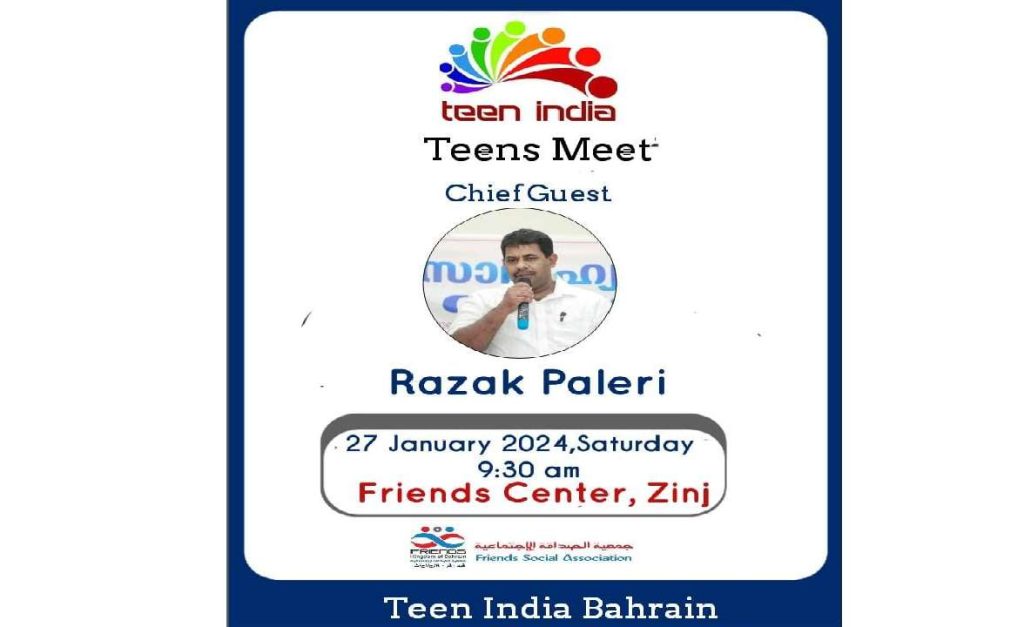 മനാമ: ഫ്രന്റ്സ് സോഷ്യൽ അസോസിയേഷന് കീഴിലുള്ള ടീൻ ഇന്ത്യ സംഘടിപ്പിക്കുന്ന വിദ്യാർഥി സംഗമം ശനി രാവിലെ 9 .30 മണിക്ക് സിഞ്ചിലെ ഫ്രന്റ്സ് സെന്റർ ഹാളിൽ സംഘടിപ്പിക്കുന്നു. എട്ട് മുതൽ പ്ലസ് ടു വരെ പഠിക്കുന്ന വിദ്യാർഥി, വിദ്യാർഥിനികളുടെ ഒത്തുചേരലിൽ കേരളത്തിലെ പ്രമുഖ ആക്ടിവിസ്റ്റും പ്രഭാഷകനുമായ റസാഖ് പാലേരി സംവദിക്കും.വാഹന സൗകര്യത്തിനും കൂടുതൽ വിവരങ്ങൾക്കും 39303961 (റിഫ), 39593782 (മനാമ), 38884102 (മുഹറഖ്) എന്നീ നമ്പറുകളിൽ ബന്ധപ്പെടാവുന്നതാണെന്ന് ടീൻ ഇന്ത്യ കൺവീനർ അനീസ് വി.കെ അറിയിച്ചു.