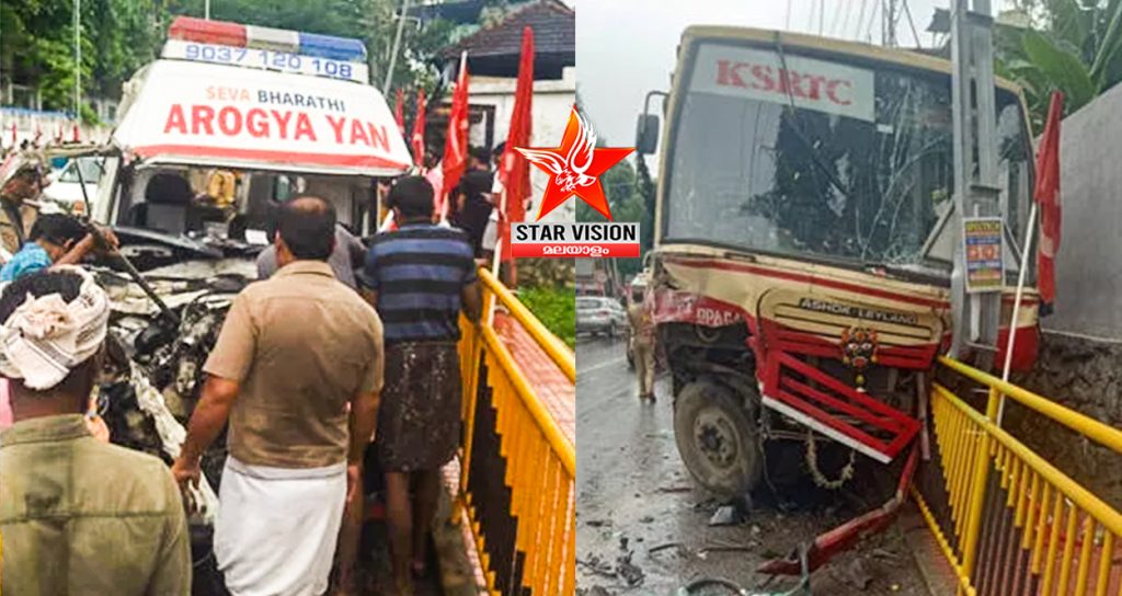 പത്തനംതിട്ട: കലഞ്ഞൂരിൽ കെഎസ്ആർടിസി ബസും ആംബുലൻസും കൂട്ടിയിടിച്ച് പത്തുപേർക്ക് പരിക്കേറ്റു. ഇതിൽ ഡ്രൈവറുൾപ്പെടെ ആംബുലൻസിൽ വന്ന നാലുപേരെ മെഡിക്കൽ കോളേജിലേക്ക് മാറ്റിയിട്ടുണ്ട്. കെഎസ്ആർടിസി ഡ്രൈവറുടെ വാരിയെല്ലുകൾക്ക് പരിക്കേറ്റുവെന്നാണ് റിപ്പോർട്ട്. പുനലൂർ- മൂവാറ്റുപുഴ സംസ്ഥാന പാതയിൽ കലഞ്ഞൂർ സ്കൂൾ ജംഗ്ഷനിൽ ഇന്ന് രാവിലെയായിരുന്നു അപകടമുണ്ടായത്. പത്തനംതിട്ട ജനറൽ ആശുപത്രിയിൽ നിന്ന് രോഗിയുമായി പോയ ആംബലുൻസാണ് അപകടത്തിൽപ്പെട്ടത്. കൂട്ടിയിടിയിൽ രണ്ടുവാഹനങ്ങളുടെയും മുൻവശം ഏറക്കുറെ പൂർണമായും തകർന്നിട്ടുണ്ട്.