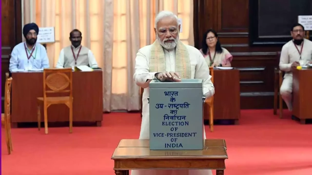 ഡൽഹി: ഉപരാഷ്ട്രപതി തിരഞ്ഞെടുപ്പിൽ പ്രധാനമന്ത്രി നരേന്ദ്രമോദി വോട്ട് രേഖപ്പെടുത്തി. പ്രധാനമന്ത്രിയുടേതാണ് ആദ്യ വോട്ട്. ജഗ്ദീപ് ധന്കർ ആണ് എൻഡിഎ സഖ്യത്തെ പ്രതിനിധീകരിക്കുന്നത്, മാർഗരറ്റ് ആൽവയാണ് പ്രതിപക്ഷ പാർട്ടികളുടെ പിന്തുണയോടെ വൈസ് പ്രസിഡന്റ് സ്ഥാനത്തേക്ക് മത്സരിക്കുന്നത്. പാർലമെന്റ് മന്ദിരത്തിൽ രാവിലെ 10 മുതൽ വൈകിട്ട് 5 വരെയാണ് വോട്ടെടുപ്പ്.