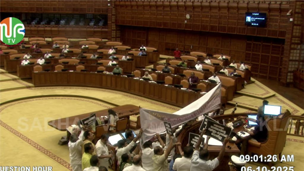 ശബരിമലയിലെ സ്വർണ്ണ മോഷണ വിവാദത്തിൽ തുടർച്ചയായി നാലാം ദിവസവും നിയമസഭ സ്തംഭിപ്പിച്ച് പ്രതിപക്ഷം. ദേവസ്വം മന്ത്രി വി എന് വാസവന്റെ രാജി ആവശ്യപ്പെട്ടാണ് പ്രതിപക്ഷ പ്രതിഷേധം. ദ്വാരപാലക ശിൽപ്പങ്ങൾ കോടീശ്വരന് വിറ്റഴിച്ചവർക്കെതിരെ നടപടി സ്വീകരിക്കുംവരെ സമരം പ്രഖ്യാപിച്ച് പ്രതിപക്ഷം സഭ ബഹിഷ്കരിച്ചു. പ്രതിപക്ഷ നേതാവ് ഗുണ്ടാനേതാവിനെപ്പോലെ പെരുമാറുകയാണെന്ന് മന്ത്രി എം ബി രാജേഷും രാജിയില്ലെന്ന് ദേവസ്വം മന്ത്രിയും പ്രതികരിച്ചു.