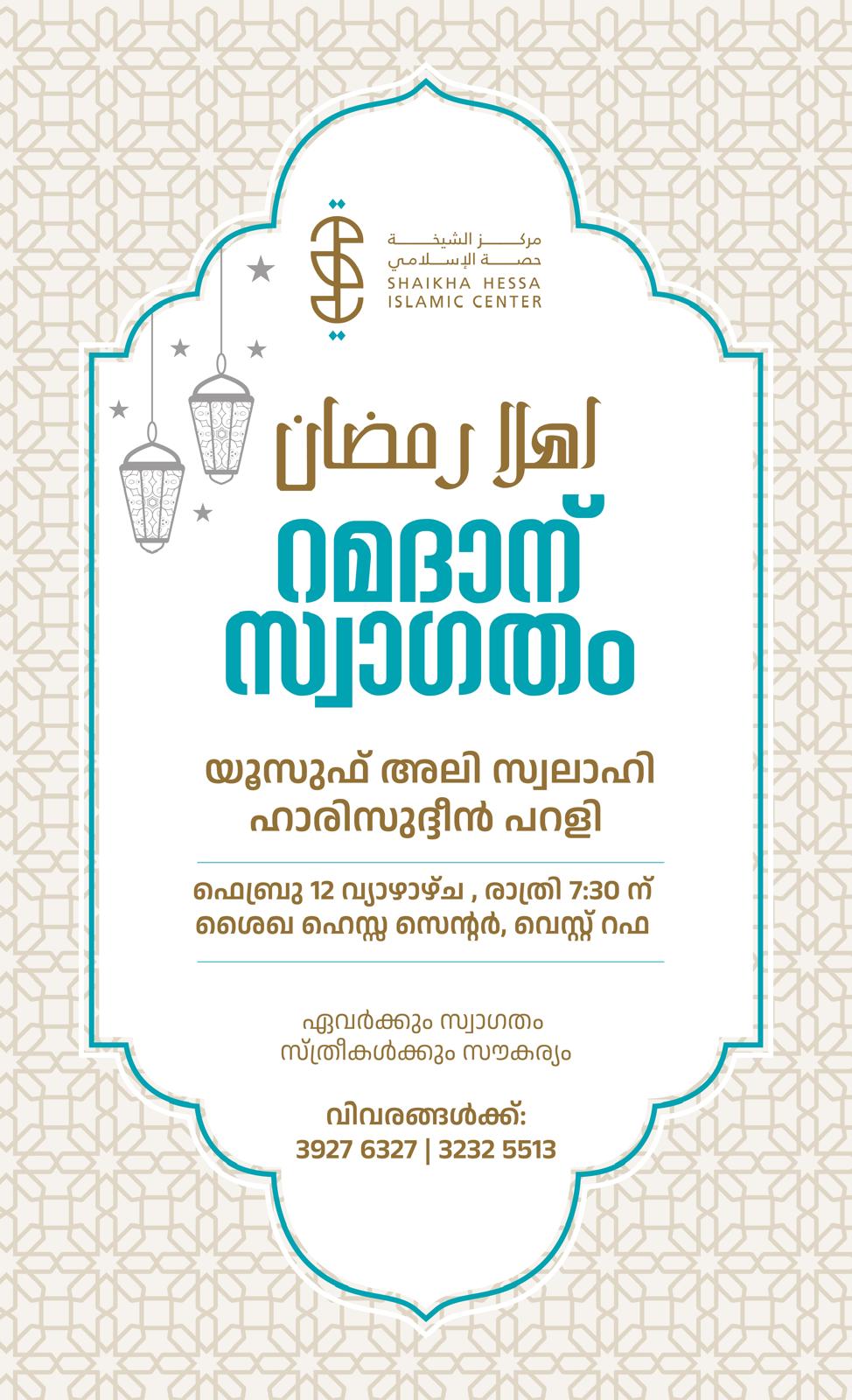 (അഹ്ലന് റമദാന്) പരിപാടി ഇന്ന് (ഫെബ്രുവരി 12) രാത്രി 7.30ന് ശൈഖ ഹെസ്സ സെന്റില് നടക്കും.