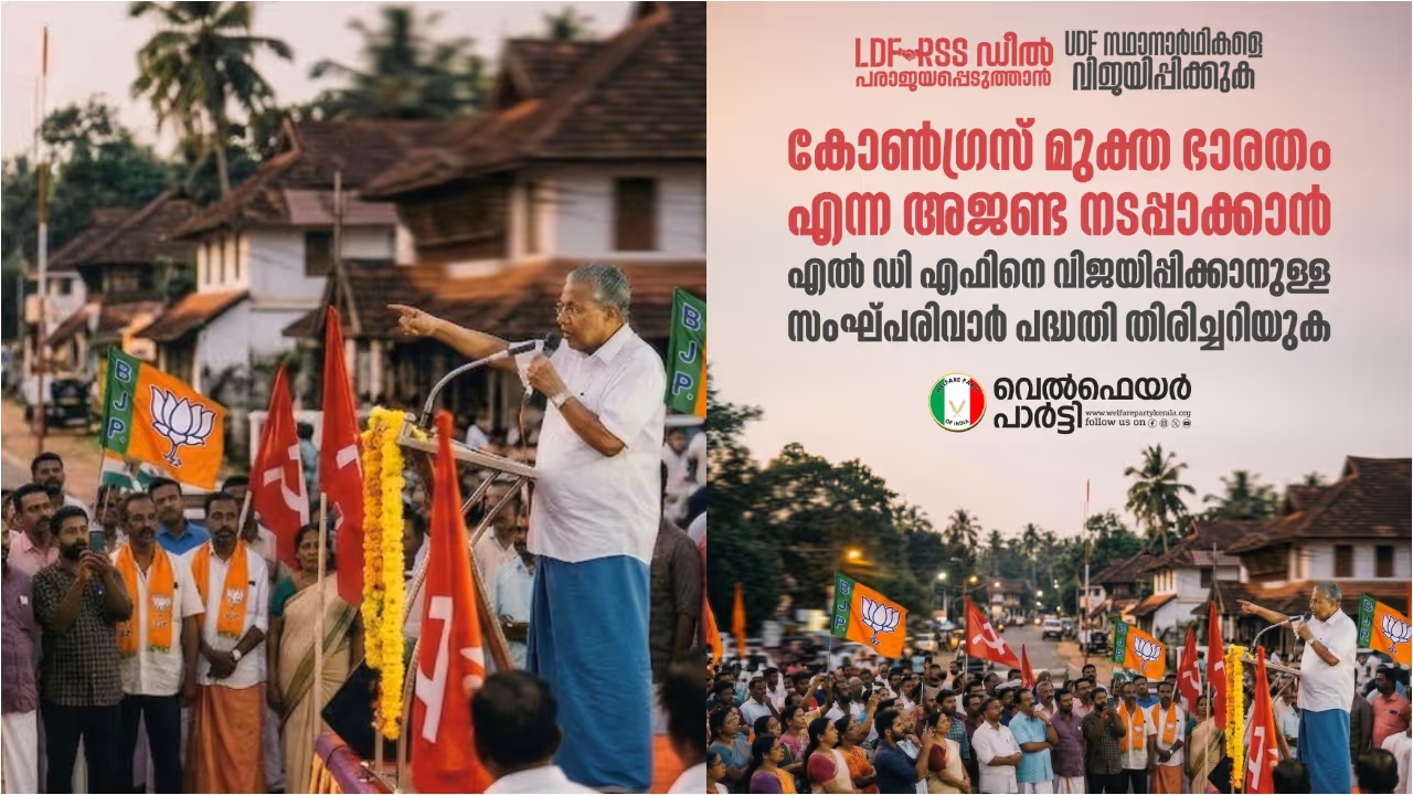 തിരുവനന്തപുരം: പ്രകോപനപരമായ എഐ ചിത്രവുമായി വെൽഫെയർ പാർട്ടി. മുഖ്യമന്ത്രി പിണറായി വിജയന്റെ ചിത്രമാണ് വെൽഫെയർ പാർട്ടി ഔദ്യോഗിക ഫേസ്ബുക്ക് പേജിൽ പ്രചരിപ്പിച്ചത്. പിണറായി വിജയൻ പൊതുസമ്മേളനത്തിൽ സംസാരിക്കുമ്പോൾ സദസിൽ ബിജെപി പതാകയുമായി ആളുകൾ നിൽക്കുന്ന ചിത്രമാണ് വെൽഫെയർ പാർട്ടി കാർഡിൽ ഉൾപ്പെടുത്തിയിരിക്കുന്നത്. ആർട്ടിഫിഷ്യൽ ഇന്റലിജൻസ് (AI) ഉപയോഗിച്ച് നിർമ്മിച്ച വ്യാജ വീഡിയോകൾ, ഓഡിയോകൾ എന്നിവ പ്രചരിപ്പിക്കരുതെന്ന് പൊലീസിന്റെയും തെരഞ്ഞെടുപ്പ് കമ്മീഷന്റെയും കർശനമായ നിർദേശം നിലനിൽക്കെയാണ് ഇത്തരത്തിൽ ചിത്രം പ്രചരിപ്പിച്ചത്. ‘എൽഡിഎഫ്-ആർഎസ്എസ് ഡീൽ പരാജയപ്പെടുത്താൻ യുഡിഎഫ് സ്ഥാനാർത്ഥികളെ വിജയിപ്പിക്കുക, കോൺഗ്രസ്സ് മുക്ത ഭാരതം എന്ന അജണ്ട നടപ്പാക്കാൻ എൽ ഡി എഫിനെ വിജയിപ്പിക്കാനുള്ള സംഘ്പരിവാർ പദ്ധതി തിരിച്ചറിയുക’ -എന്നതാണ് പോസ്റ്ററിലെ മുദ്രാവാക്യം.