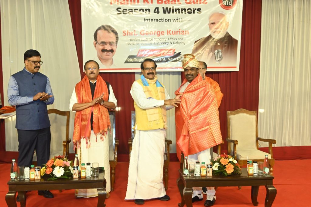 കേരളത്തില് നിന്നുള്ള മന് കീ ബാത്ത് ക്വിസ് സീസണ് ഫോര് വിജയികള് കേന്ദ്രമന്ത്രി ശ്രീ ജോര്ജ് കുര്യനുമായി ദല്ഹിയിലെ ഔദ്യോഗിക വസതിയില് കൂടിക്കാഴ്ച നടത്തി. കോവില്മല രാജാവ് രാമന് രാജമന്നാന് മുഖ്യാതിഥിയായിരുന്നു.